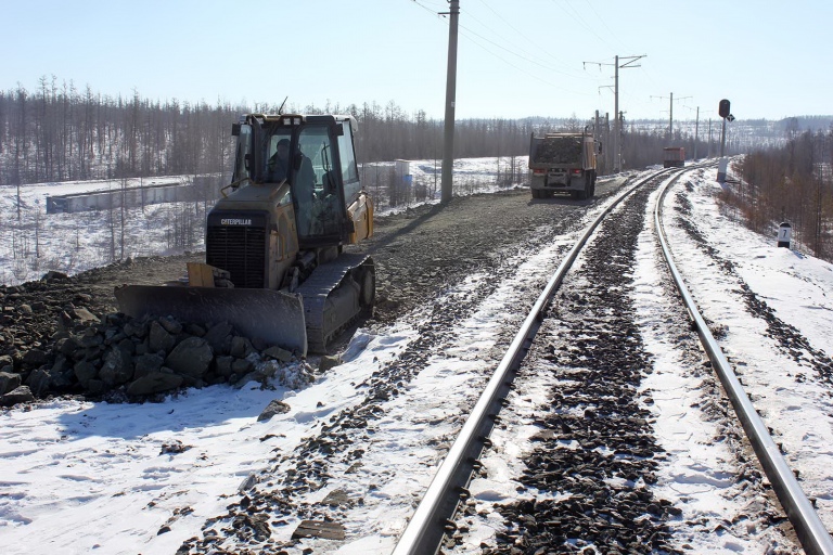 - На перегоне в первую очередь мы выполнили устройство водоотводных канав с обеих сторон насыпи. Они позволят отвести воду от земполотна и стабилизировать его. На нескольких участках, где наблюдается сильный водоток, канавы устилаются матрасами «Рено». Для сохранения вечной мерзлоты производится охлаждающая наброска на откосы, - рассказывает начальник участка МК-7 Сергей Бойко. - За 40 лет на ряде участков земполотно под второй путь просело, поэтому там, где это необходимо, строители досыпали его до проектных отметок.